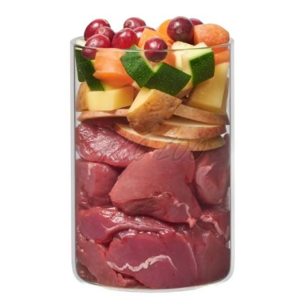 Compoziție: Carne slabă de antilopă (50%), morcov, dovlecel, cartof (11%), pară (4%), ulei de canola, castravete, făină de cocos*, făină de castane* (1%), afine, drojdie de bere*, cochilie de stridie*, mușețel* (0,2%), măceșe*, pământ diatomaceu*, salvie*, chimen*, chimen*, argilă montmorillonită, alge marine*, nutrienți minerali.