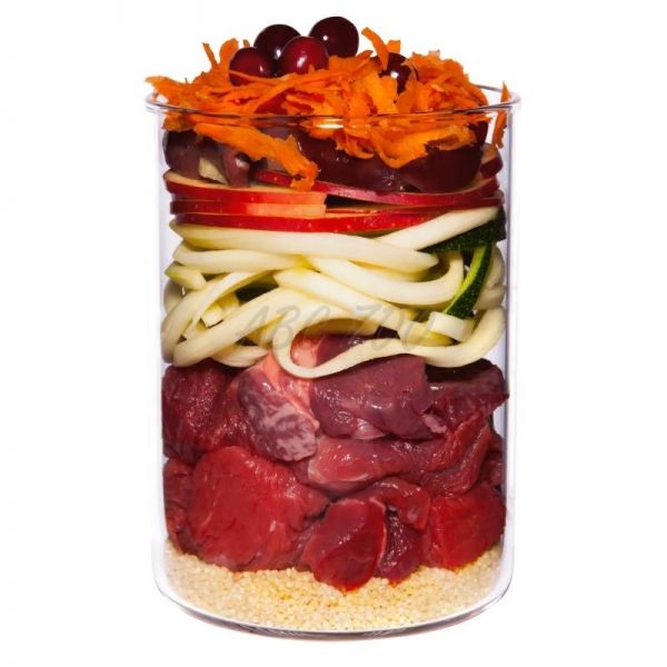 Compoziție: Inimă de vită (30%), plămân de vită (14%), dovlecel, morcov (11%), ficat de vită (7%), mei, mușchi de vită (5%), măr (4%), ulei de canola, făină de dovleac (1%), stridii*, drojdie de bere*, afine, busuioc*, pătrunjel*, pământ cu diatomite*, pulbere de măceșe* (0,2%), argilă minerală*, sare andină, alge marine*, minerale.