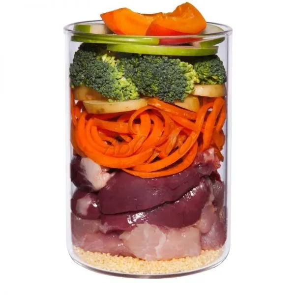 Raport carne : orez natural : legume/fructe/herburi : alte ingrediente = 63 % : 29 % : 5 % : 3 %