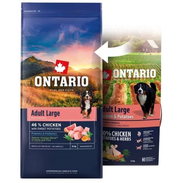 Ontario Adult Large este o hrană super-premium cu pui și cartofi dulci pentru câini adulți din rase mari, pentru a susține vitalitatea și digestia sănătoasă.