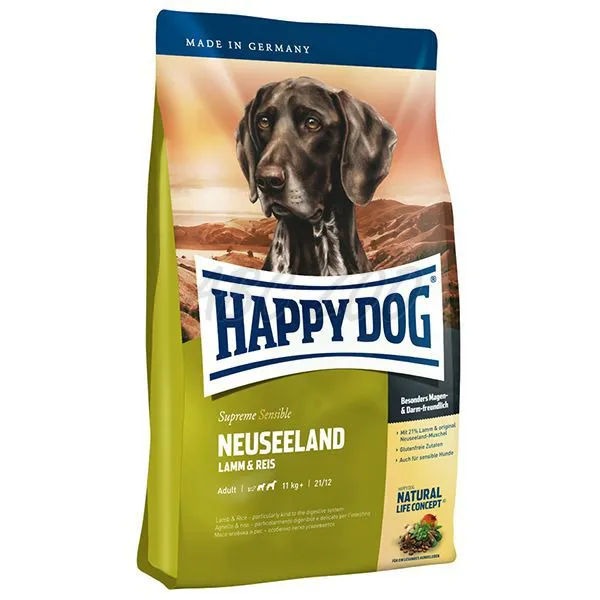 Hrana are un conţinut de  21% carne de miel şi carne de midie valoroasă din Noua. Happy Dog Supreme Neuseeland este un produs din ingrediente foarte bine alese, prelucrate cu grijă. Datorită acestor ingredinte este o reţetă  specială uşoară pentru stomac și flora intestinală. Hrană recomandată şi pentru câini mofturoşi.