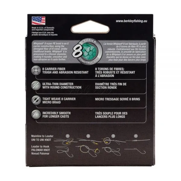 Berkley® Whiplash® 8 este o șnură legendară, bine cunoscută ca fiind una dintre cele mai puternice de pe piață! Este perfect împletită din 8 fibre folosind material 100% PE. Indiferent dacă pescuiești în apă dulce sau sărată, poți conta întotdeauna pe puterea extremă a Whiplash 8.