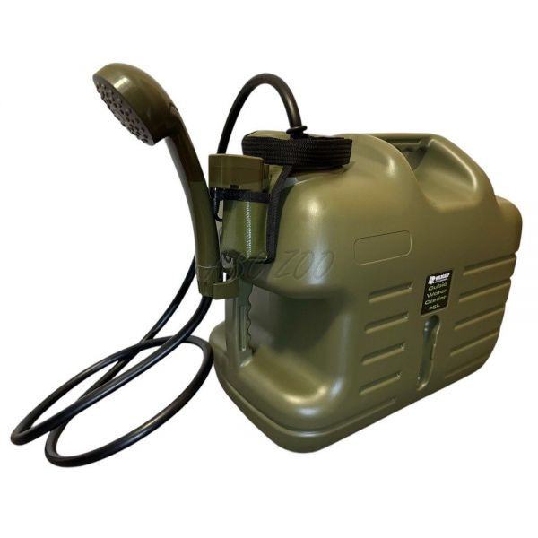Set complet de duș de camping portabil cu acumulator încorporat și canistru de 25L.