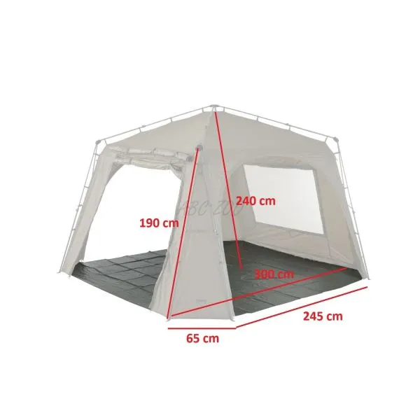 Acoperișul din material M-TEC300 cu textură hexagonală are o coloană de apă de 8000 mm și o rezistență mecanică crescută. Pe partea din spate se află o fereastră mare cu plasă de țânțari și acoperire din nailon, echipată cu funcția de microventilație atunci când se folosește contraforța în partea inferioară a feronerie. Peretele frontal este format dintr-un panou de intrare deschizător cu o fereastră mare dotată cu plasă de țânțari, PVC transparent și acoperire din nailon. Panoul frontal de tip letter box poate fi deschis din lateral și rulat în sus în mod clasic sau poate fi desfăcut parțial și deschis de sus în jos.