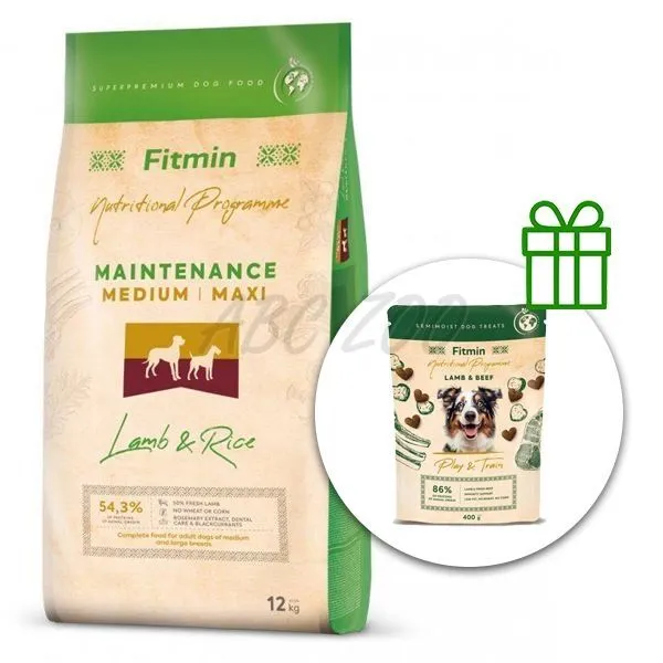 Fitmin Maintenance Medium / Maxi Lamb & Rice 12 kg + Fitmin Play&Train Lamb & Beef GRATUIT