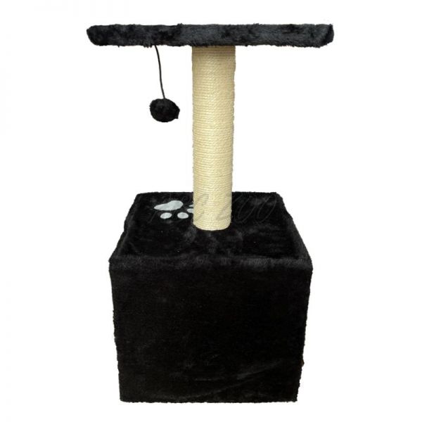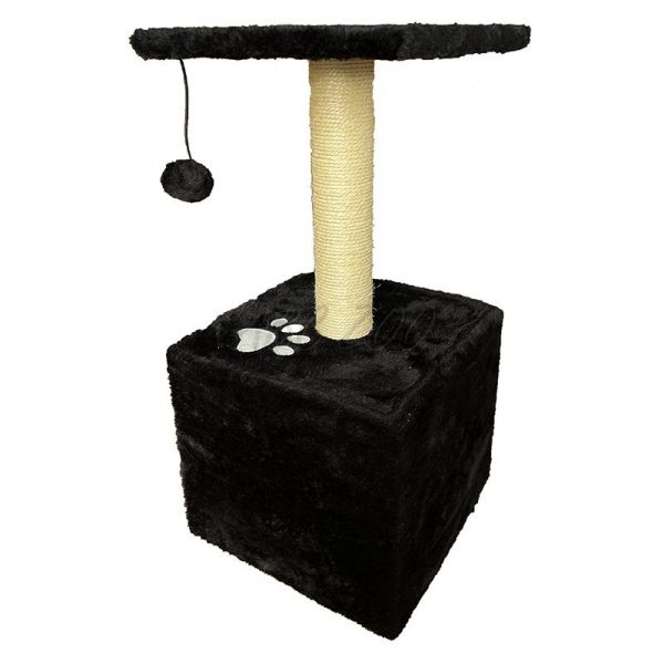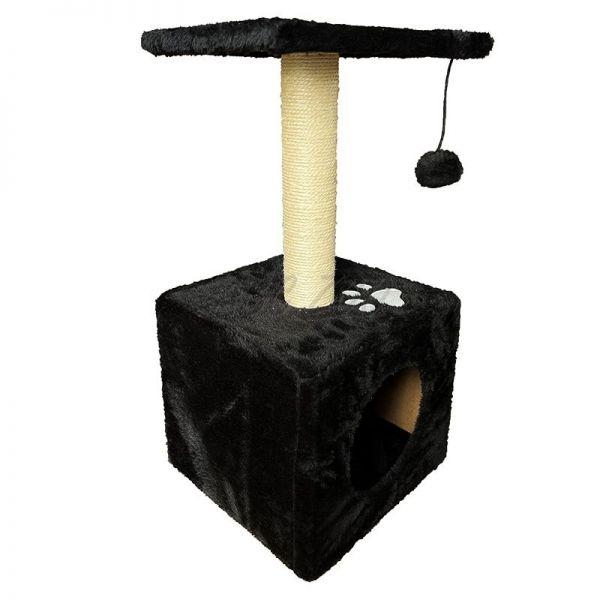 Zgârietoare multifuncțională pentru pisici, care combină un stâlp rezistent din sisal pentru zgâriat, o platformă pufoasă pentru odihnă și o căsuță confortabilă pentru ascuns. Datorită jucăriei suspendate în formă de bilă, oferă și distracție interactivă, reducând plictiseala și stresul nedorit. Designul elegant de culoare neagră cu un model de labă se integrează perfect în orice interior. Ideală pentru pisici de toate vârstele și dimensiunile.