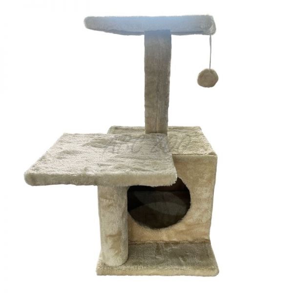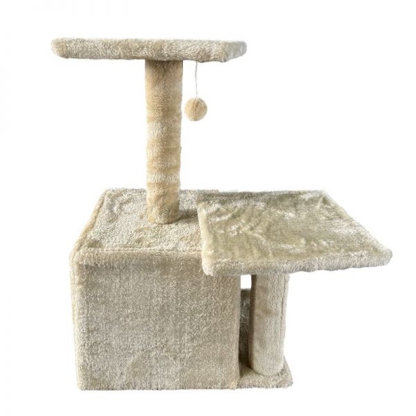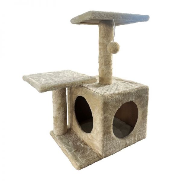 Acest zgârieț pe mai multe niveluri este ideal pentru pisicile active care adoră să se cațere și să observe împrejurimile de sus. Dispune de două platforme, dintre care una este mai sus – perfectă pentru a urmări activitatea din casă. În partea de jos se află o căsuță închisă, care oferă un loc confortabil pentru odihnă. Tapițeria moale din pluș și jucăria suspendată stimulează curiozitatea și activitatea pisicii.
