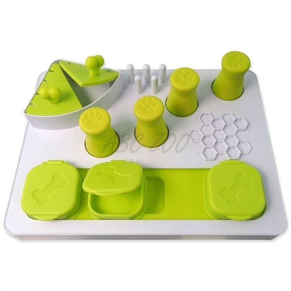 • câinele poate folosi laba sau botul pentru a muta pătratele din plastic, a le deschide sau a ridica părți ale jucăriei pentru a obține o recompensă