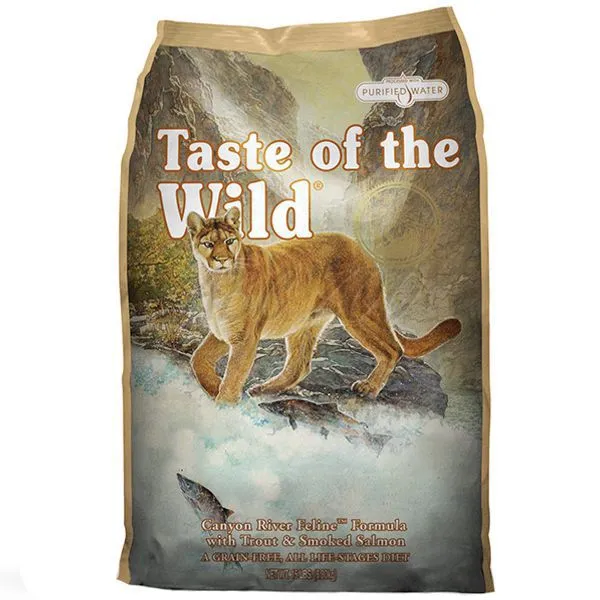 TASTE OF THE WILD Canyon River Feline, hrană integrală sub formă de granule pentru orice rasă de pisică și pentru oricare vârstă. Această hrană figurează pe lista Top Dry Foods fiind titularul unei premii importante internaționale.