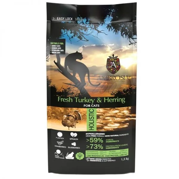 Ambrosia Sterilized Cat este o hrană completă fără cereale, cu carne proaspătă de curcan și hering, destinată pisicilor adulte sterilizate.