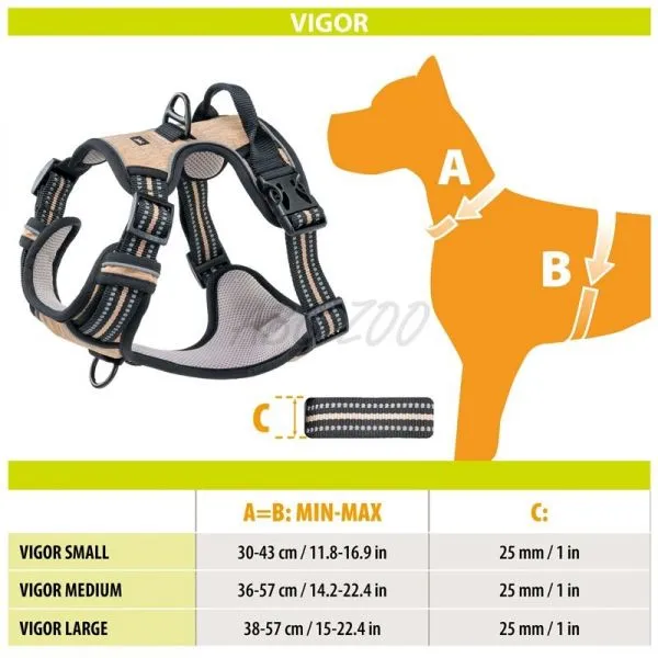 Ham-ul VIGOR a fost conceput pentru a oferi confort maxim în timpul antrenamentului – are căptușeli moi care protejează pielea câinelui de frecări și presiuni. Dispune de două inele pentru lesă (în față și în spate), ceea ce permite ajustări variate și un control sporit în diferite situații de antrenament. Datorită materialelor robuste, bretelelor reglabile și varietății de culori și mărimi, este potrivit pentru diferite rase și tipuri de activități.