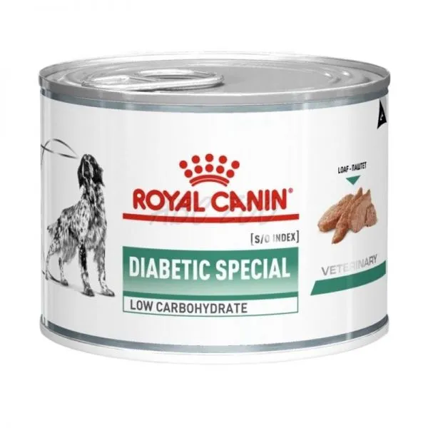 Diete veterinare speciale sub formă de hrană conservată pentru câini adulți cu diabet zaharat.
