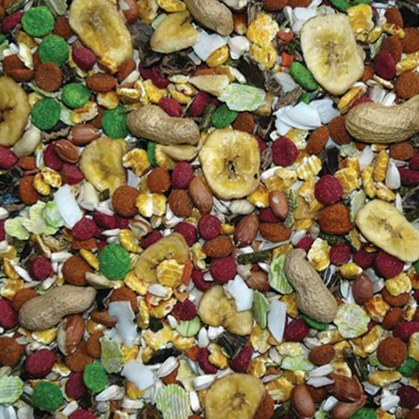Ingrediente: fructe (banane, mere, stafide, boabe de soc) grâu și porumb extrudat, fulgi de grâu, roșcovă, alune, fulgi de mazăre, colorant galben, fulgi de porumb, sorghum, barley, alfalfa, orz, ovăz, morcovi, hrișcă