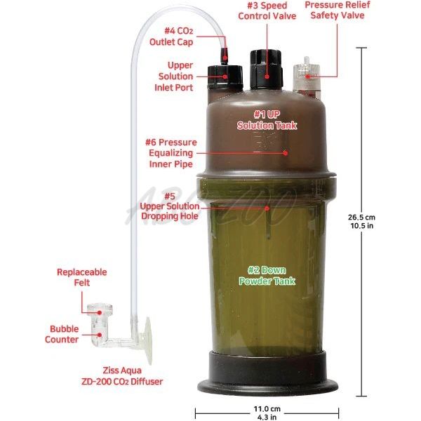 Generator de CO₂ de înaltă calitate, ușor de reglat, pentru susținerea unei creșteri viguroase a plantelor acvatice. ZissAqua ZC-II funcționează fără curent electric, oferă CO₂ extrem de curat (99 %) și este potrivit atât pentru începători, cât și pentru aquascaperi profesioniști. Sistemul se montează în afara acvariului și furnizează CO₂ prin difuzorul ZD-200 inclus, care ajută simultan la scăderea pH-ului și la limitarea algelor nedorite și a agenților patogeni.
