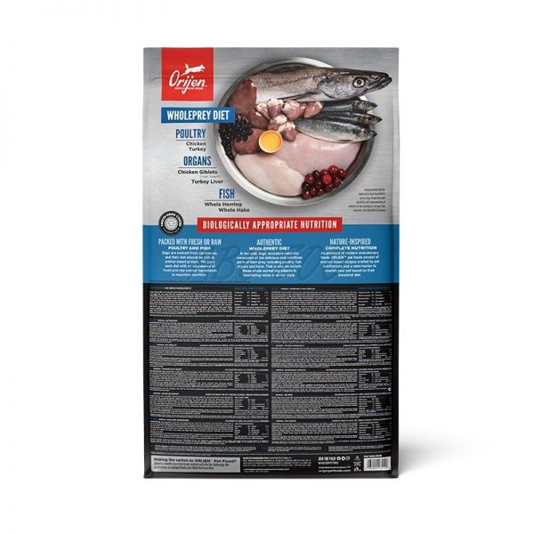 Ingrediente: carne prospătă de pui(13%), carne proaspătă de curcan (7%), ouă proaspete întregi(7%), ficat proaspăt de pui (6%), hering proaspăt întreg (6%), cambulă proaspătă (5%), ficat proaspăt de curcan( 5%), gât proaspăt de pui (4%), inimă proaspătă de pui (4%), inimă prospătă de curcan (4%), carne de pui deshidratat (4%), carne de curcan deshidratat(4%), macrou întreg deshidratat (4%), sardine întregi deshidratate (4%), linte roșie întreagă, mazăre verde întreagă, linte verde întreagă, năut întreg, mazăre galben întreg, boabe întregi Pinto, boabe întregi de fasole albă, ulei de hering (1%), grăsime de pui (1%), cartilaj de pui liofilizat (1 %), ficat de curcan uscat la rece, dovleac proaspăt întreg, mazăre întreagă proaspătă, pastarnac întreg proaspăt, morcovi proaspeți, mere întregi şi proaspeţi Red Delicious, pere Bartlett întregi şi proaspeţi, varză proaspătă, spanac proaspăt, frunză de sfeclă roşie proaspătă, frunze de morcovi proaspeţi, alge marine maro, afine întregi, cicoare, turmeric, armurariu, lavandă, rădăcină de hibiscus, măceșe.