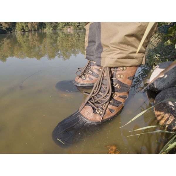 Șnururile de calitate cu ochiuri și cârlige metalice fixează ferm piciorul, iar tăietura înaltă protejează la zăpadă adâncă. Marginea superioară facilitează încălțarea. Designul maro-negru se potrivește echipamentului de pescuit, vânătoare și outdoor.