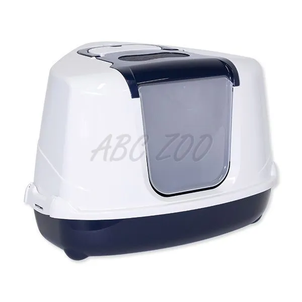 Litieră de colț pentru pisici prevăzută cu un mâner practic și o lopățică atașată de partea interioară a acesteia unde se află și un filtru de asemenea. Uși care se deschid pe ambele părți, deschidere și închidere facilă a capacului de sus. Baza și câteva detalii de deasupra sunt de culoare albastră iar capacul este de culoare albă.