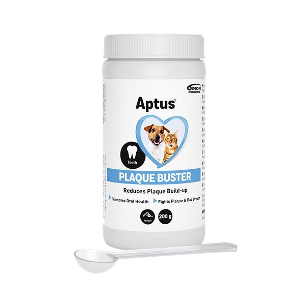 Aptus Plaque Buster powder este un supliment alimentar natural destinat reducerii plăcii dentare și tartrului la câini și pisici. Conține alga marină Ascophyllum nodosum, care contribuie la o sănătate orală mai bună și la o respirație proaspătă. Praful se adaugă cu ușurință în rația zilnică de hrană și, prin utilizarea pe termen lung, ajută la prevenirea problemelor dentare și gingivale.
