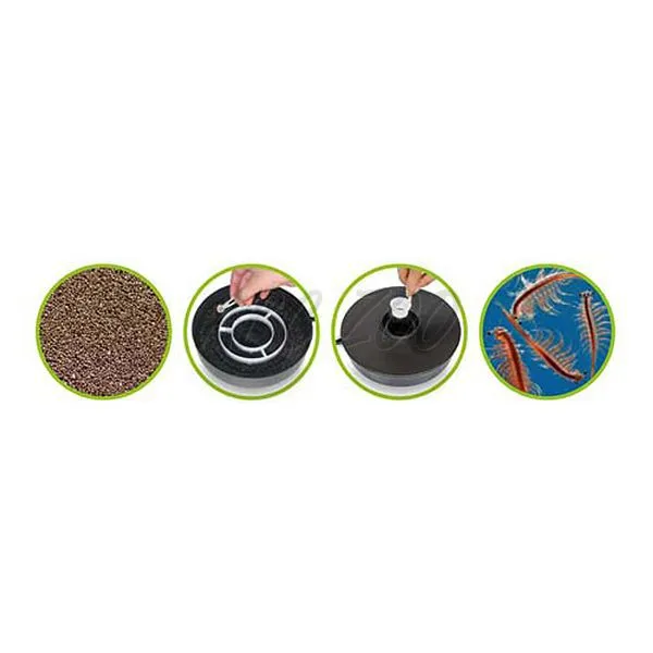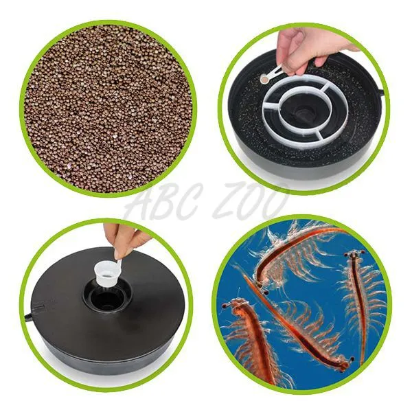 Instrucțiuni de folosire: 3 lingurițe de sare Artemia se diolvă într-un litru de apă și turnați în vas până la nivelul pentru apă marcat. Puneți ouălele după necesități în jurul cercului exterior și închideți capacul. La temperatura camerei artemia va ecloza după 36 - 48 ore. Nauplia va fi atrasă de lumină și gravitate către centrul sitei, de unde poate fi extrasă comfortabil și folosită.