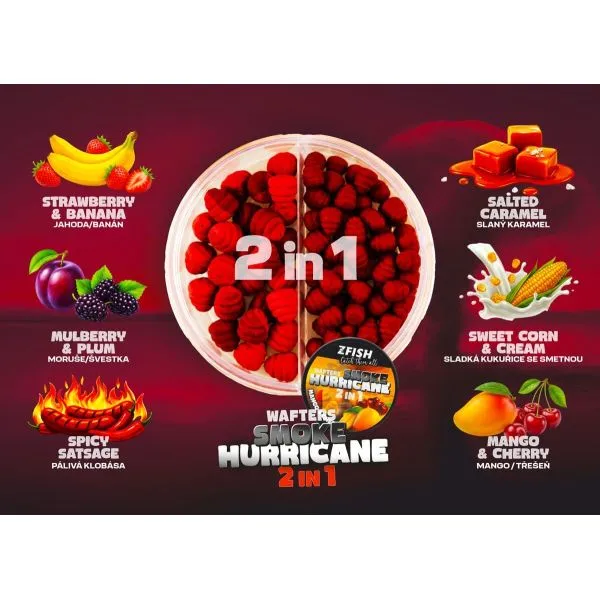 Hurricane wafters reprezintă o momitoare unică, cu un design distinctiv, care generează în apă un semnal vizual și olfactiv foarte puternic. La contactul cu apa, se eliberează un nor colorat atrăgător, completat de o aromă intensă a aromelor dovedite, ceea ce poate atrage peștii chiar și de la distanțe mai mari.