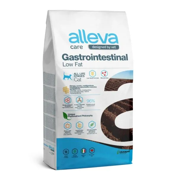 Alleva Care Gastrointestinal Low Fat este o hrană foarte digestibilă, cu un conținut scăzut de grăsimi, un conținut crescut de sodiu și potasiu și o sursă selectată de fibre solubile (psyllium, dovleac, XOS) și alte prebiotice. Rețeta este îmbogățită cu un complex de fitonutrienți din plante, care sunt benefice pentru ameliorarea diareei și pentru sănătatea tractului digestiv, precum și cu un complex de trei tulpini de drojdii selectate și foarte purificate, capabile să lege patogenii și să sprijine imunitatea în tractul digestiv. De asemenea, este recomandată ca suport pentru metabolismul grăsimilor în cazurile de hiperlipidemie.