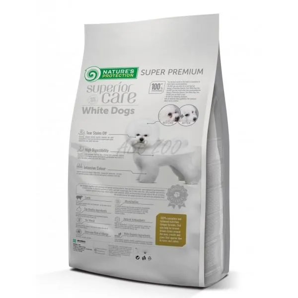 Natures Protection Superior care white dog este o hrană completă cu carne de miel pentru câinii adulți din rasele de talie mică și mini (1-10 kg la vârsta adultă) cu păr alb.