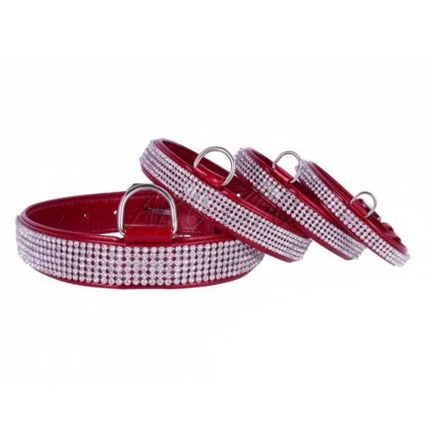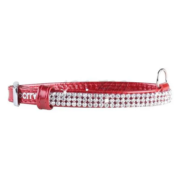 Zgardă din piele lucioasă de culoare roșie cu pietre de cristal, lungime de 21 - 29 cm, lățime de 12 mm.