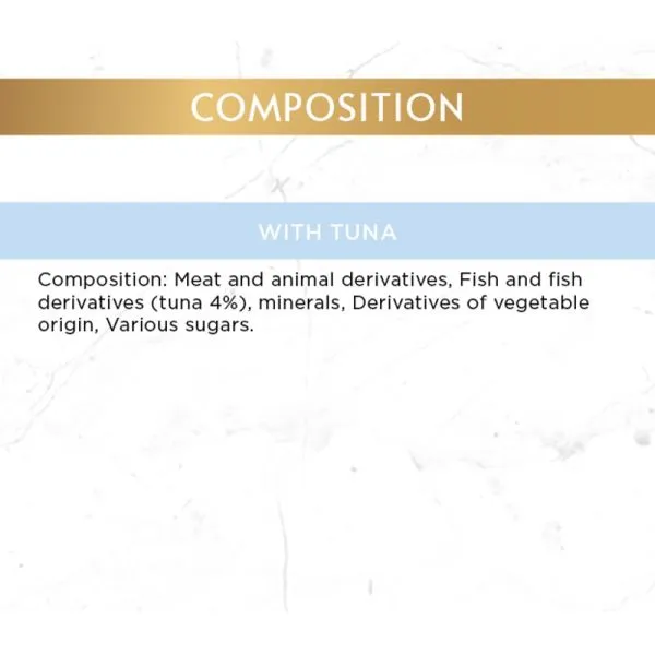 Chiar și cele mai pretențioase pisici vor aprecia această pastă specială cu gust de ton. Este potrivită pentru pisici adulte de orice talie.   Ingrediente: carne și subproduse din carne, pește și subproduse din pește(din care 4% ton), subproduse de origine vegetală, minerale, zaharuriAnaliza componentelor: umiditate 77%, proteine 11%, grăsimi 7%, cenușă 3%, fibre 0.1%