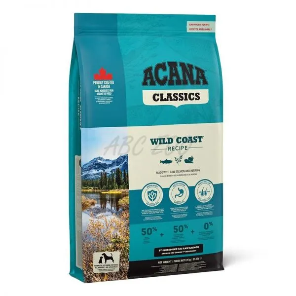 ACANA Wild Coast o hrană valoroasă și echilibrată biologic ce conține carne de pește (hering, halibut, merluciu - zărgan).