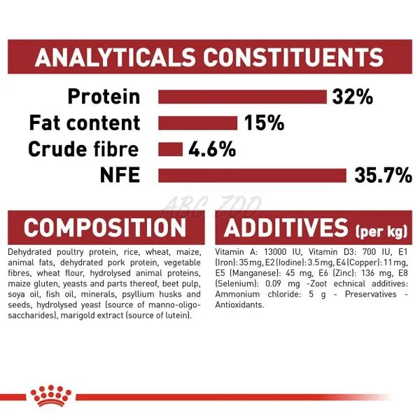 Compoziție: Carne de pasăre deshidratată, orez, grâu, porumb, grăsimi animale, carne de porc deshidratată, fibră vegetală, făină de grâu, proteine animale hidrolizate, gluten de porumb, pulpă de sfeclă, ulei de soia, ulei de pește, minerale, coji și semințe de psyllium, drojdii hidrolizate (sursă de manano-oligozaharide), extract de gălbenele (sursă de luteină).