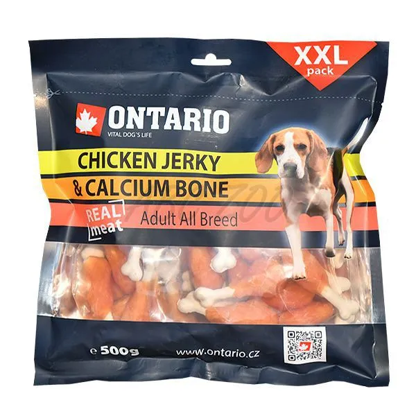 Recompensă pentru câini, hrană deliciu ONTARIO - Chicken Jerky and Calcium Bone – Deliciu sub formă de pulpă de pui cu os de calciu. Este un produs 100% natural.
