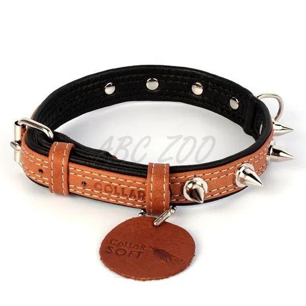 Zgardă SOFT din piele pentru câini, de culoare negru-maro prevăzute cu ţepi de metal.