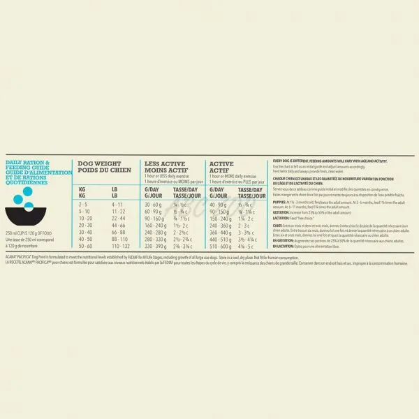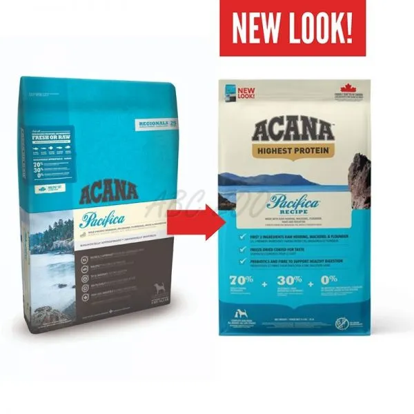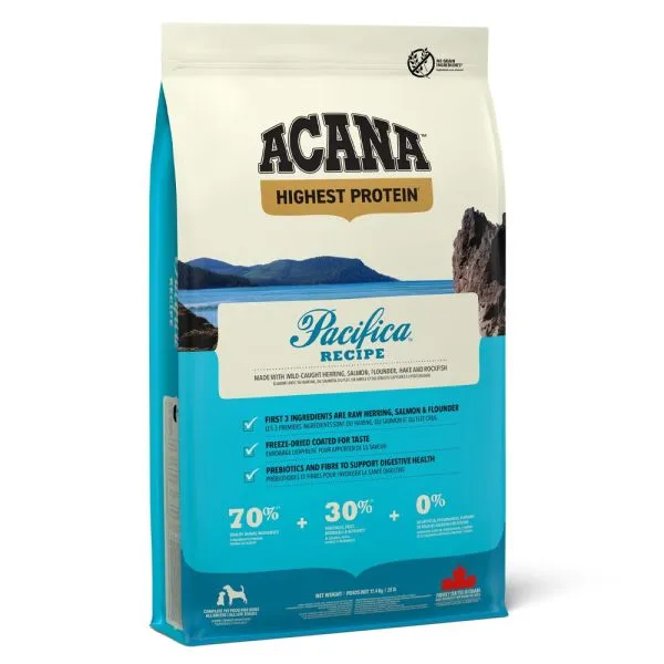 ACANA Pacifica este hrană completă, canadiană, fără cereale și cu carne de calitate care conține pește de mare potrivit pentru câinii de toate rasele și vârstele.