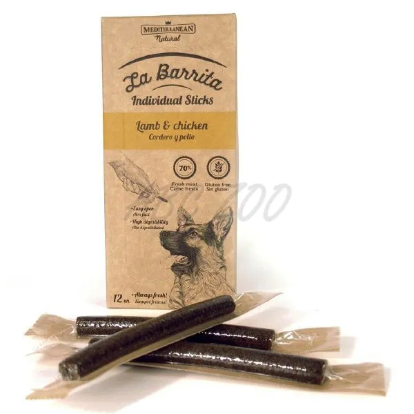 MEDITERRANEAN NATURAL La Barrita - hrană recompensă  de calitate ambalată în vid, sub formă de bastoane  care conține 70% carne proaspătă de miel și carne de pui, potrivită pentru câini.