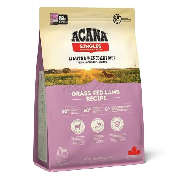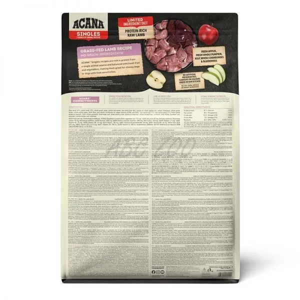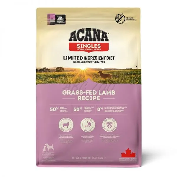 ACANA Grass-Fed Lamb este hrană monoproteică adecvată din punct de vedere biologic pentru câinii sensibili de toate rasele și dimensiunile. Conținutul este de 50% miel și 50% fructe, legume și ierburi.