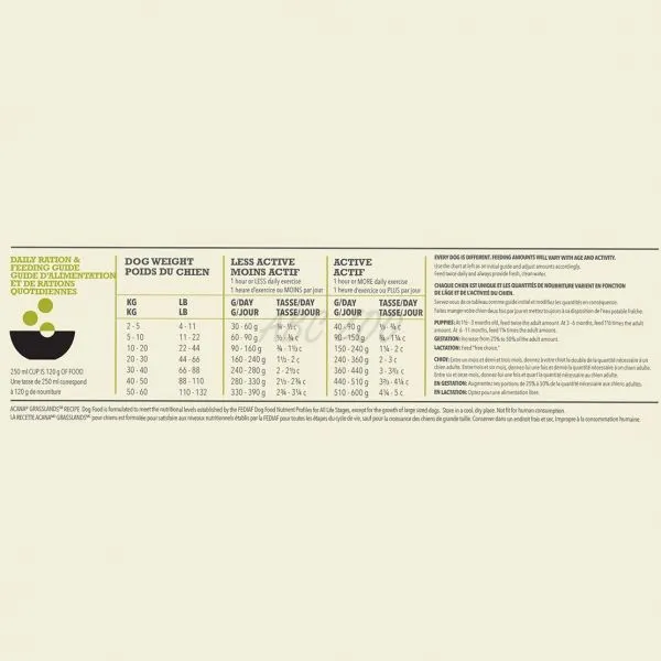 ACANA Grasslands este hrană completă, canadiană, fără cereale cu gust de rață și miel potrivită pentru câinii de toate rasele și dimensiunile.