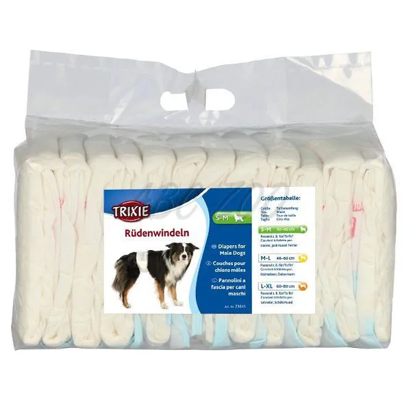 Scutece de unică folosinţă special realizate  (pentru câini masculi) potrivite după intervenții chirurgicale, în caz de incontinenţă urinară la câine, la călătorii lungi.