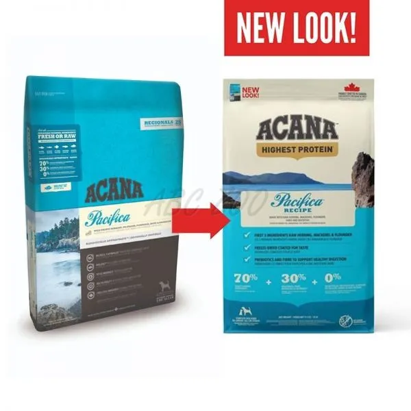 ACANA Pacifica este hrană completă, canadiană, fără cereale și cu carne de calitate care conține pește de mare potrivit pentru câinii de toate rasele și vârstele.