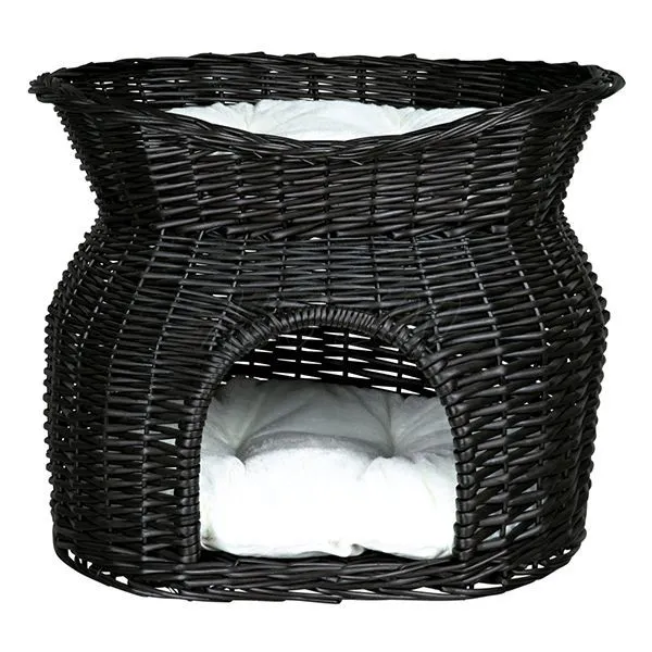 Pat din răchită cu 2 zone de relaxare, potrivit pentru câini și pisici, de culoare neagră.