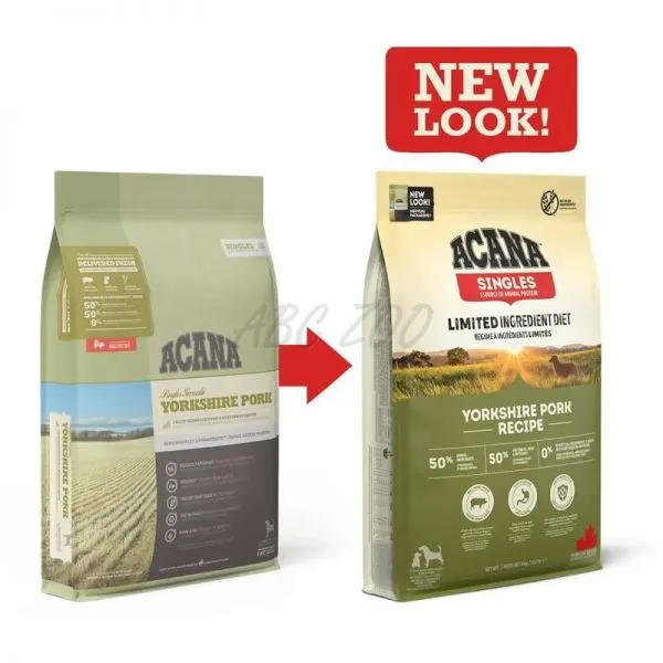ACANA Yorkshire Pork este o hrană monoproteică  biologică adecvată  pentru câinii sensibili de toate rasele și dimensiunile. Conține 50%  carne de porc din sortimente și 50%  fructe, legume și ierburi.