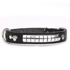 Zgardă neagră realizată din piele fină, de înaltă calitate și decorată cu aplicații metalice.