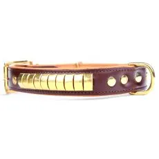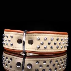 Zgardă maro - bej realizată din piele cu aplicații metalice.
