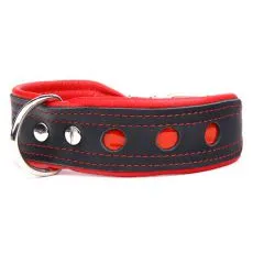 Zgardă din piele roșu cu negru cu aplicații metalice.