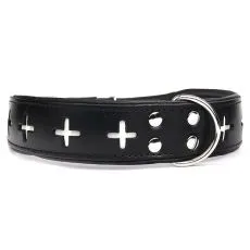 Zgardă pentru câine negră din piele decorată cu cruci albe.