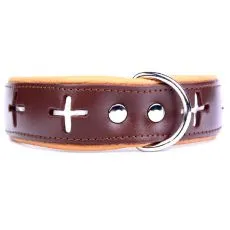 Zgardă pentru caine maro-bej  din piele decorată cu cruci albe.