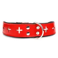 Zgardă pentru caine roșie-negră  din piele decorată cu cruci albe.