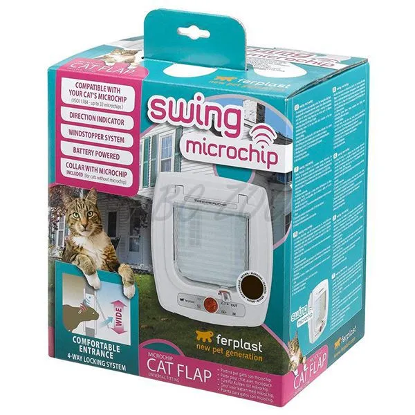 Folosind această ușă lăsați animăluțul să iasă și să intre în casă fără ajutorul dumneavoastră. Mai mult de atât puteți fi siguri că folosind Swing Microchip nu veți avea vizitatori nepoftiți în casă deoarece sistemul inovativ al acestuia recunoaște doar cipul animăluțului dumneavoastră. Dacă pisica dumneavoastră nu are cip este în regulă deoarece pachetul include o zgardă și un cip pe care îl puteți atașa de zgarda pisicii.