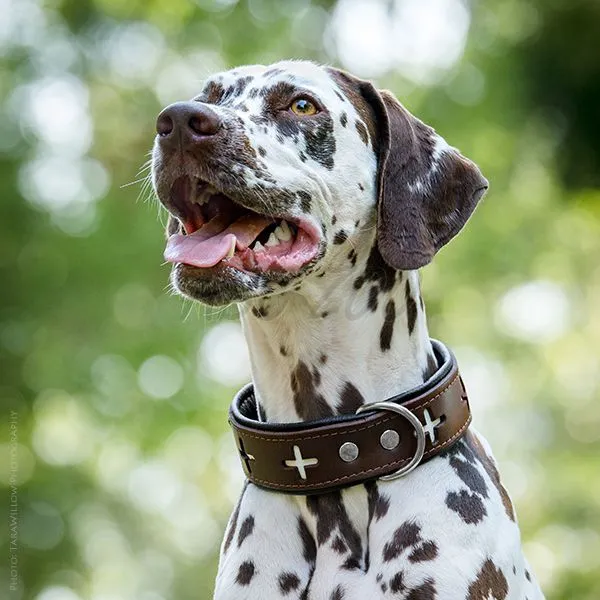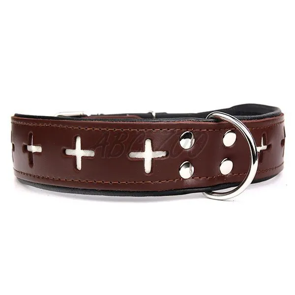 Zgardă pentru caine, maro-negru  din piele decorată cu cruci albe pe fond alb.