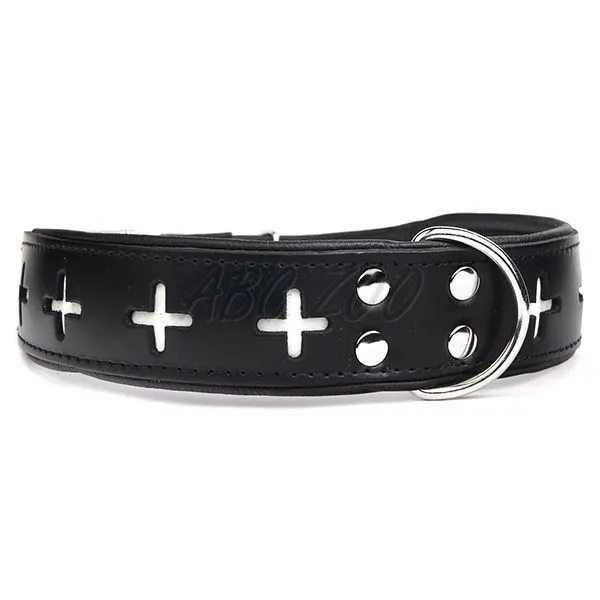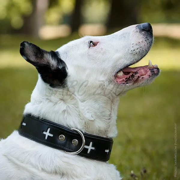 Zgardă pentru câine, neagră  din piele decorată cu cruci albe pe fond alb.