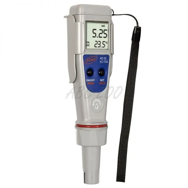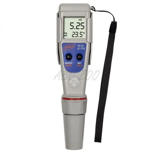 Conductometrul EC/TDS/°C Adwa AD32 are conductivitate impermeabilă, TDS și tester de temperatură. Carcasa este complet impermeabilă împotriva umidității. Conductivitatea și citirile de TDS sunt compensate în mod automat pentru temperatură (ATC), iar valorile temperaturii pot fi afișate în unități °C sau °F.